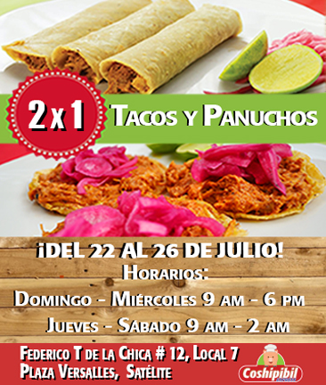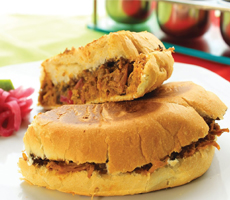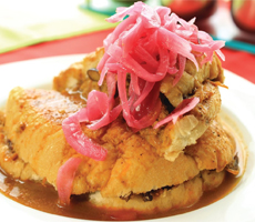 Rellena de cochinita o pollo pibil, bañada en caldito pibil, salsa de habanero asado y cebolla morada.